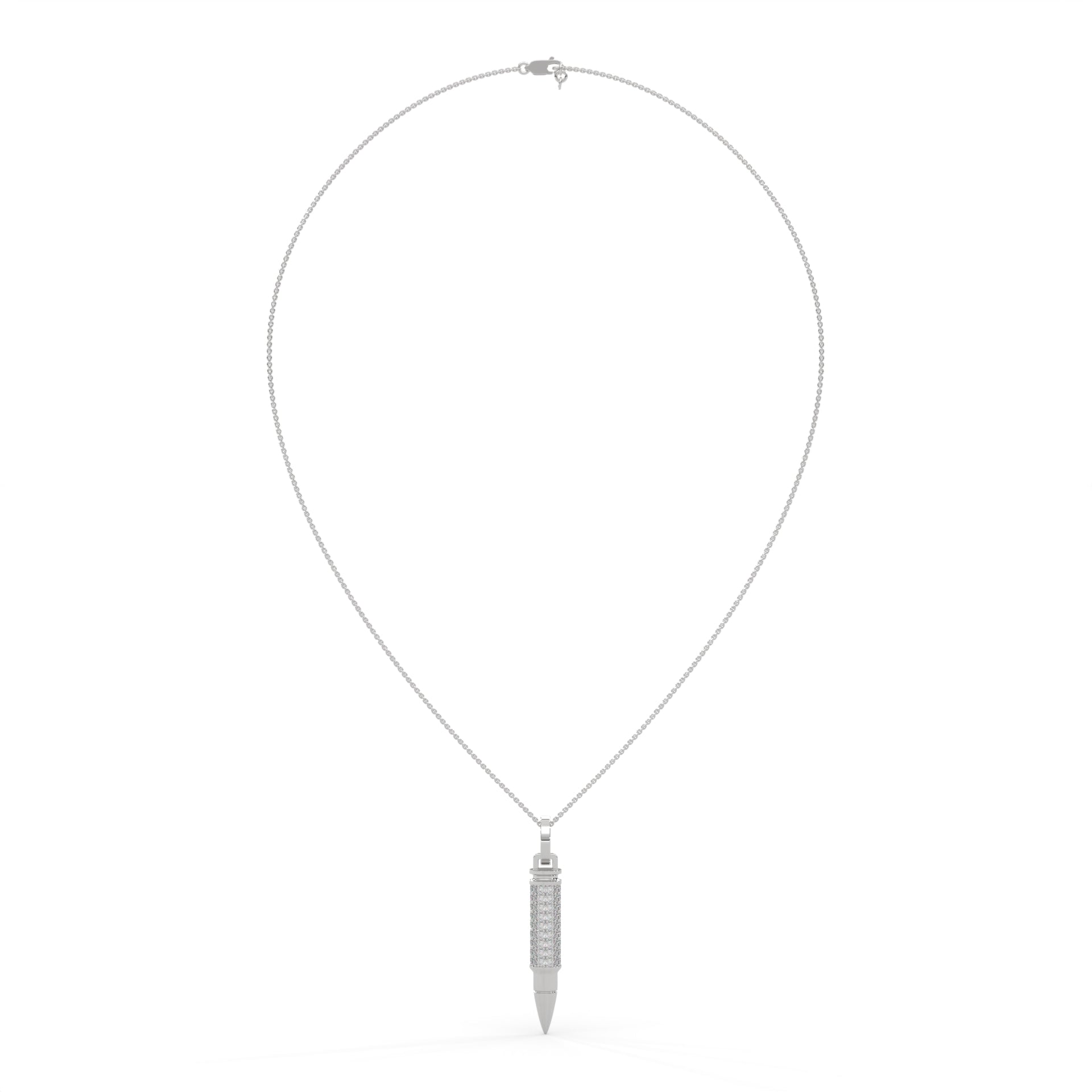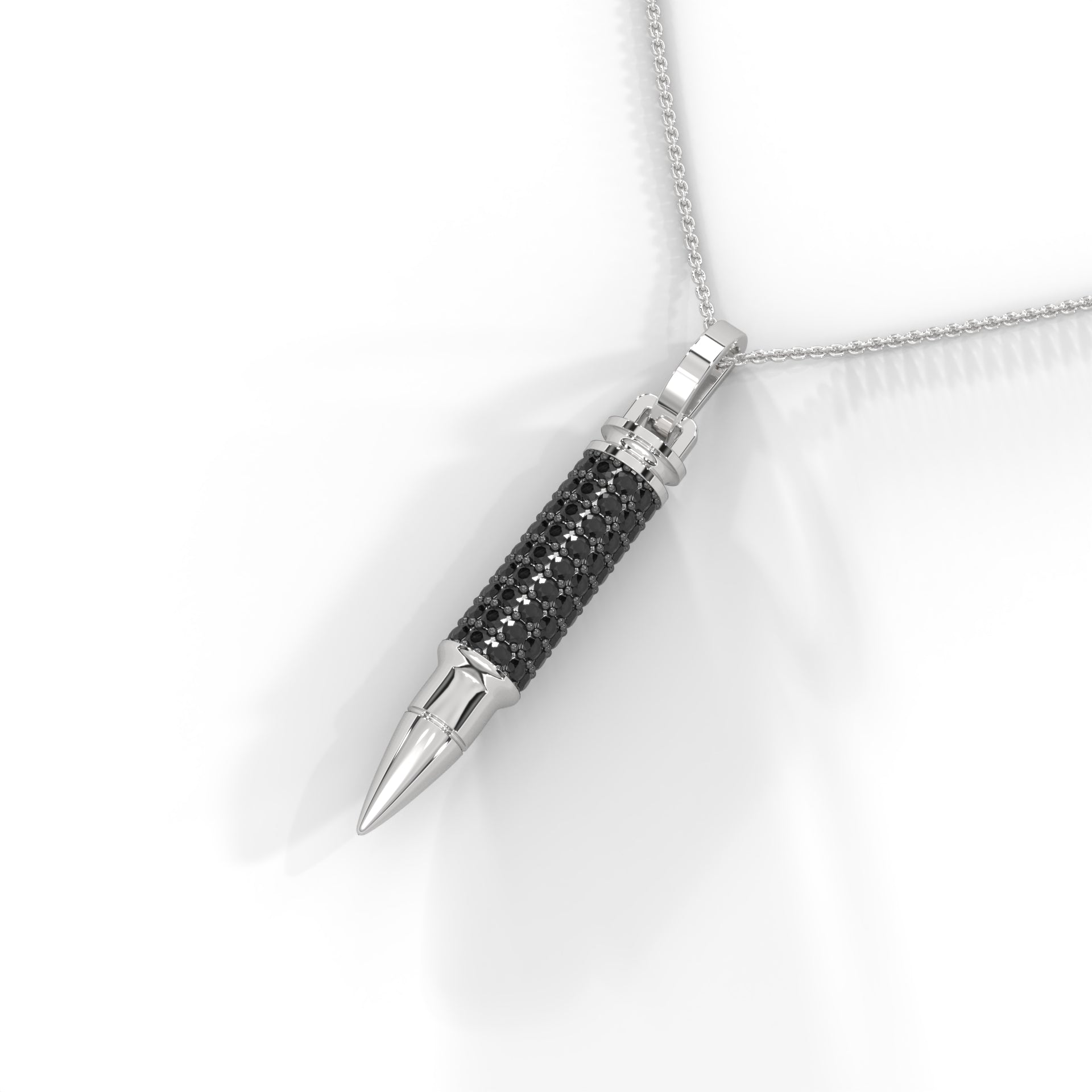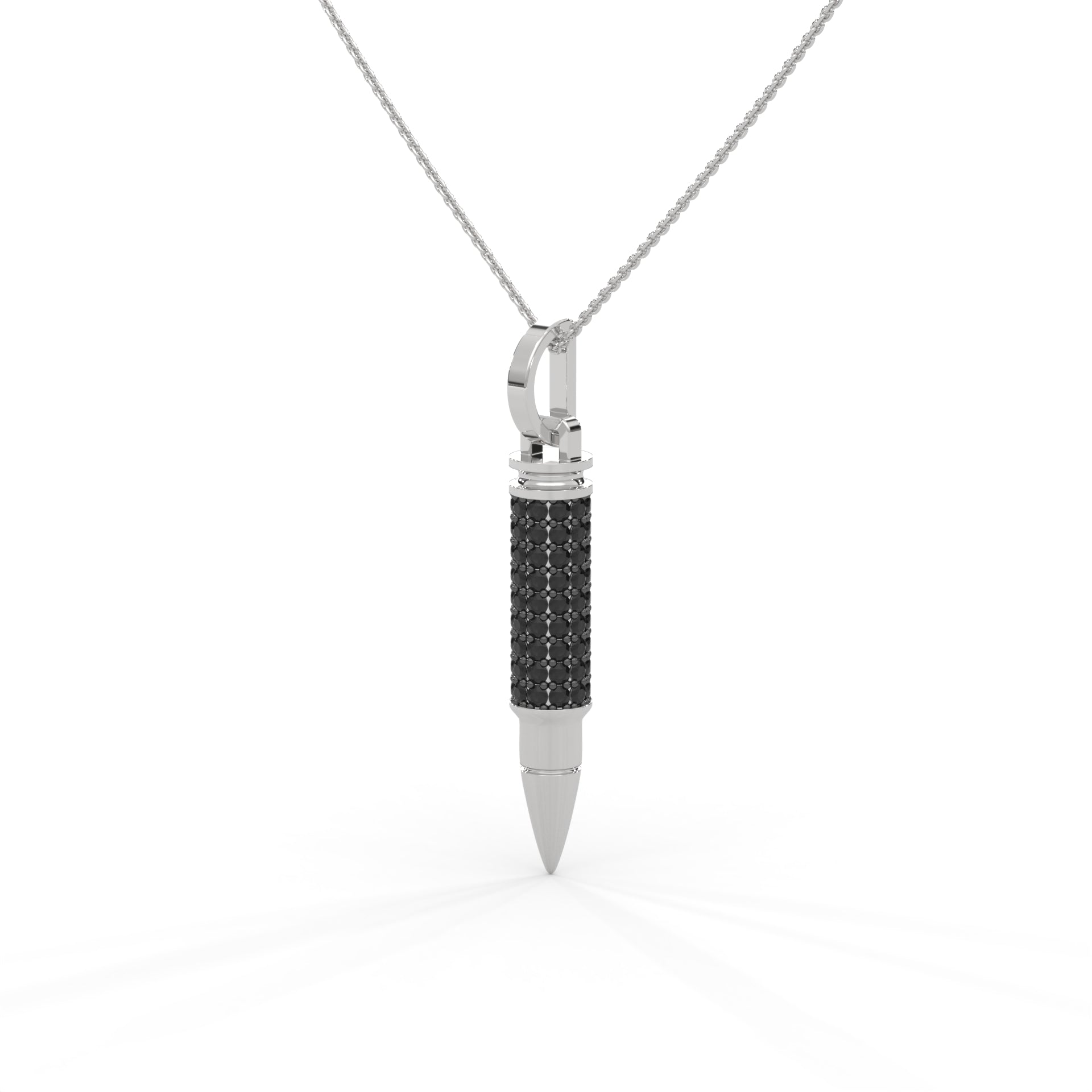 A symbol of precision, power, and timeless edge — The .925 Ammo Pendant from Noble redefines bold luxury. Crafted in polished sterling silver, its sleek silhouette is adorned with your choice of either radiant white synthetic diamonds or striking black synthetic diamonds, each meticulously handset to capture light with every movement.