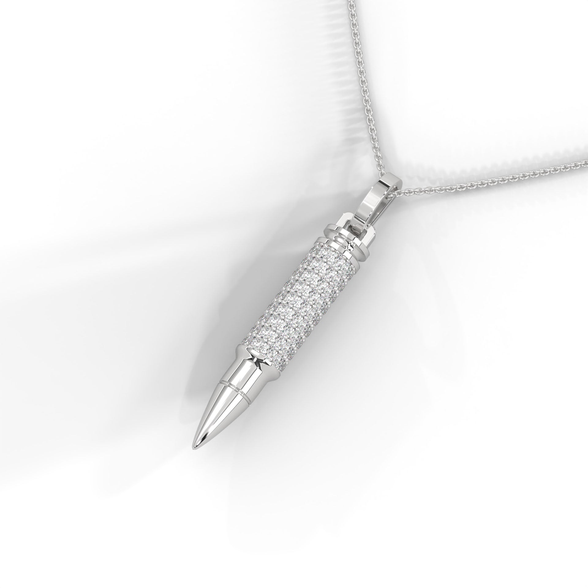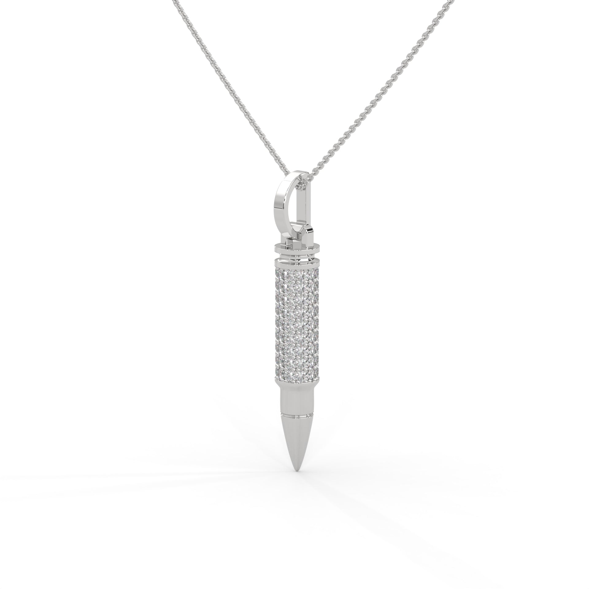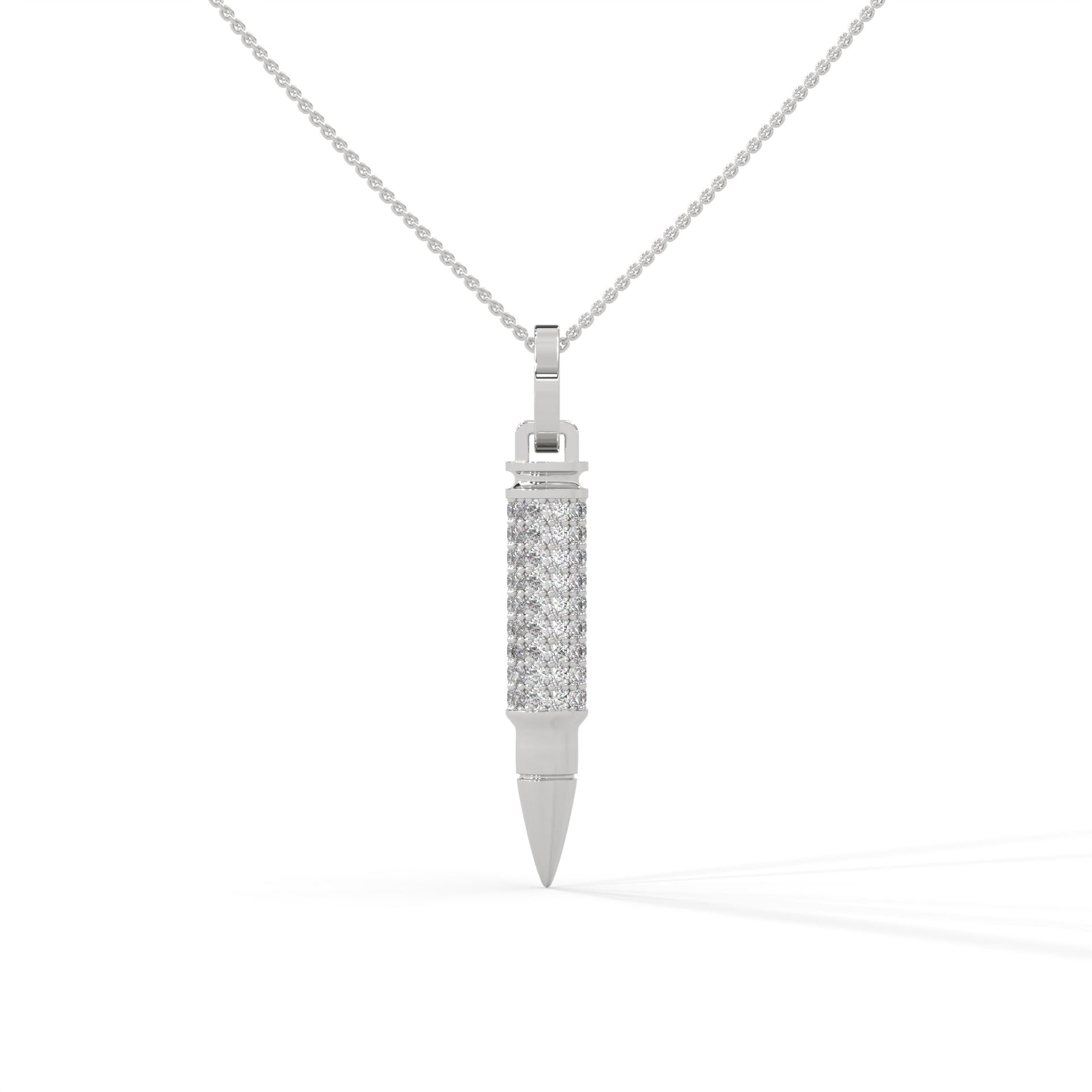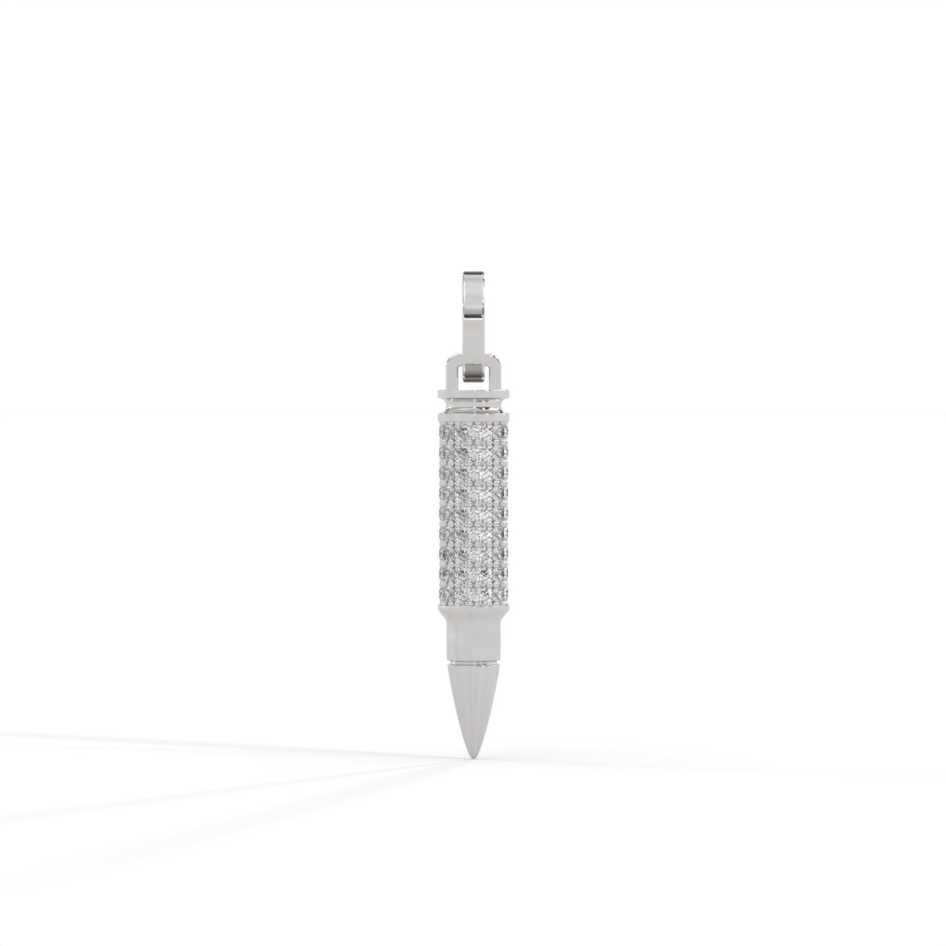 A symbol of precision, power, and timeless edge — The .925 Ammo Pendant from Noble redefines bold luxury. Crafted in polished sterling silver, its sleek silhouette is adorned with your choice of either radiant white synthetic diamonds or striking black synthetic diamonds, each meticulously handset to capture light with every movement.