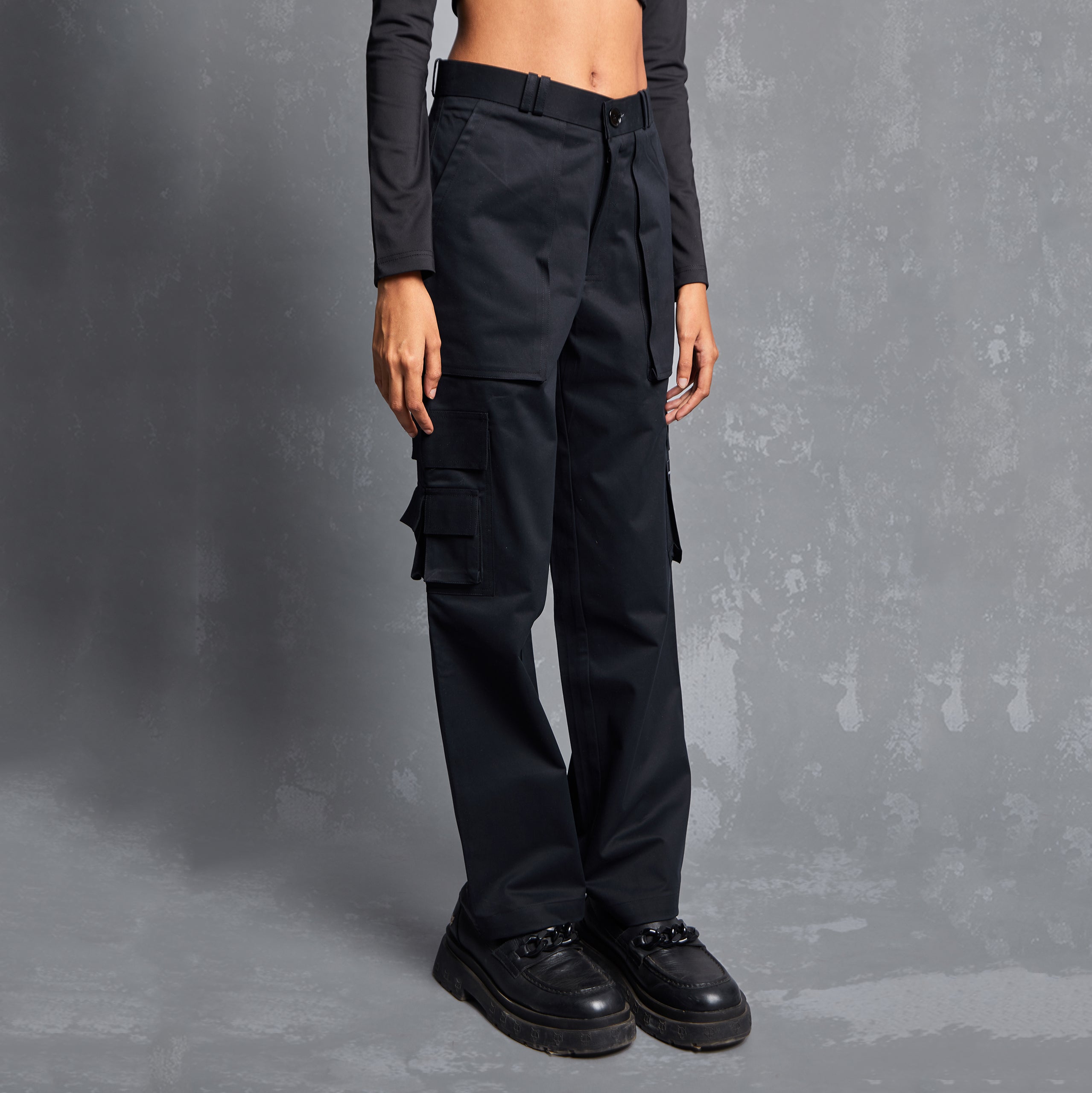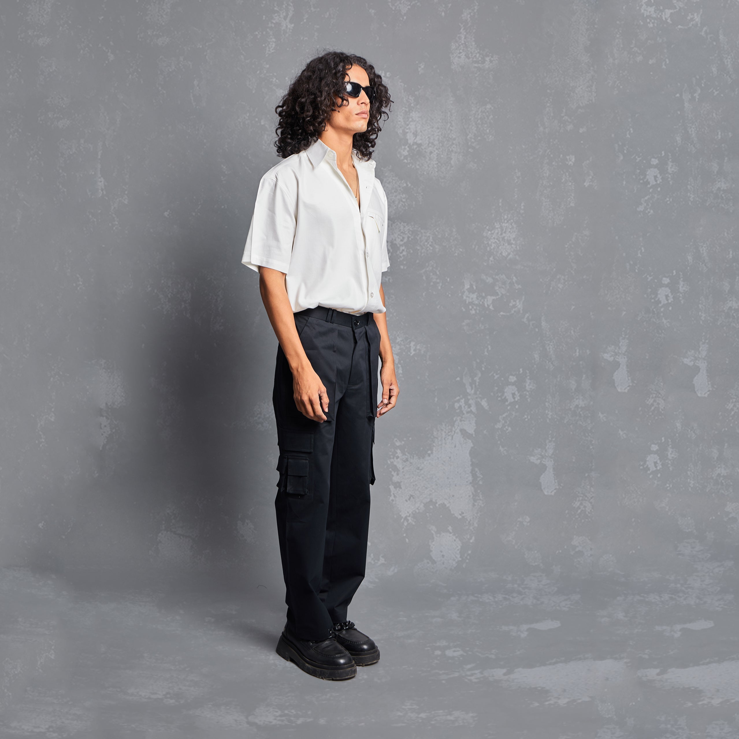 The Utility Cargos Type-2 are made in a straight fit pattern and crafted in a 100% cotton fabric. The top pockets feature a minimal harmonium detail, while the pockets on the middle section are relatively intricate, having a reverse box pleat detail, a Warping Theories woven label on the left side and overlapping 3D pockets on the right side.