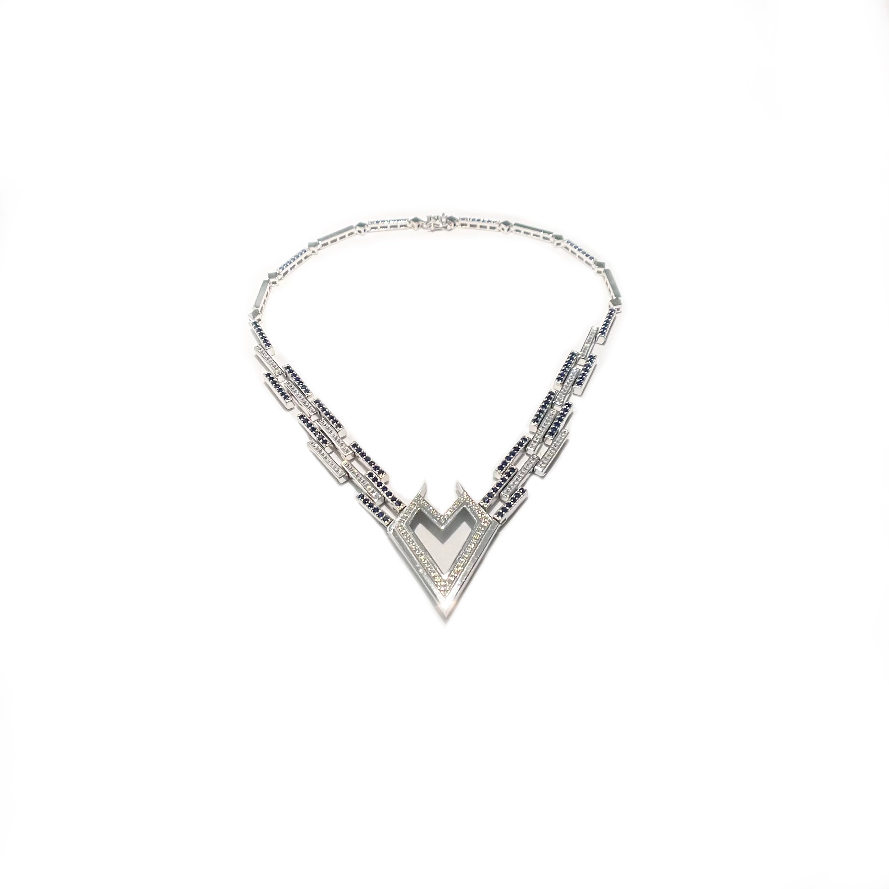 The Digital Heart necklace with binary links and a linear heart centre piece studded with White Baguettes and Blue Sapphire Crystals.