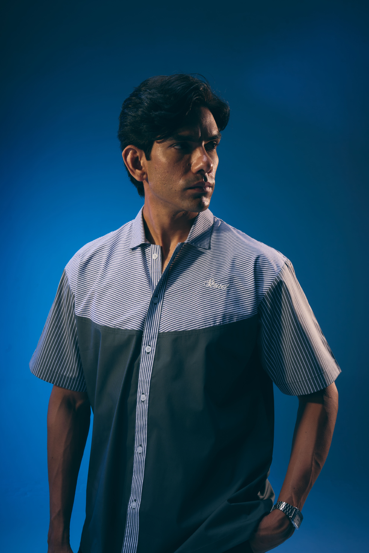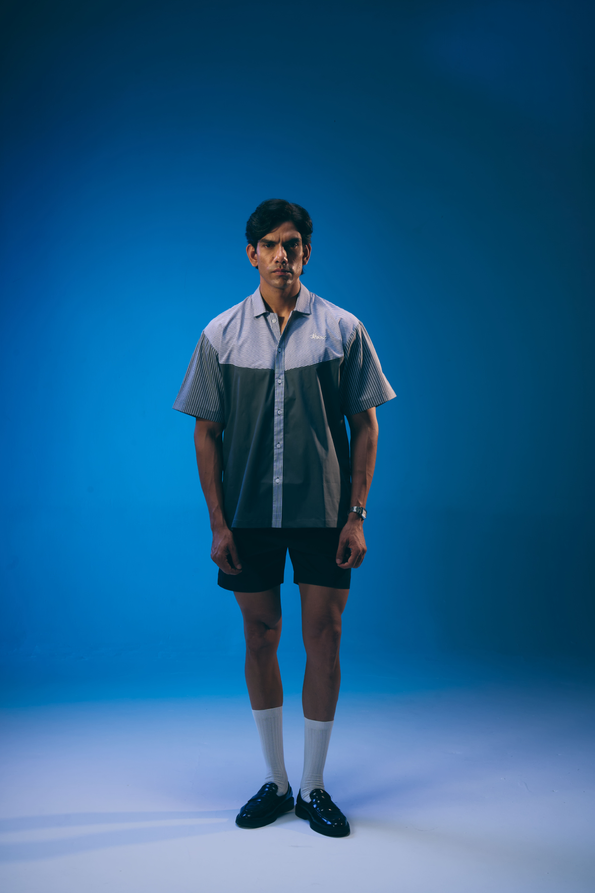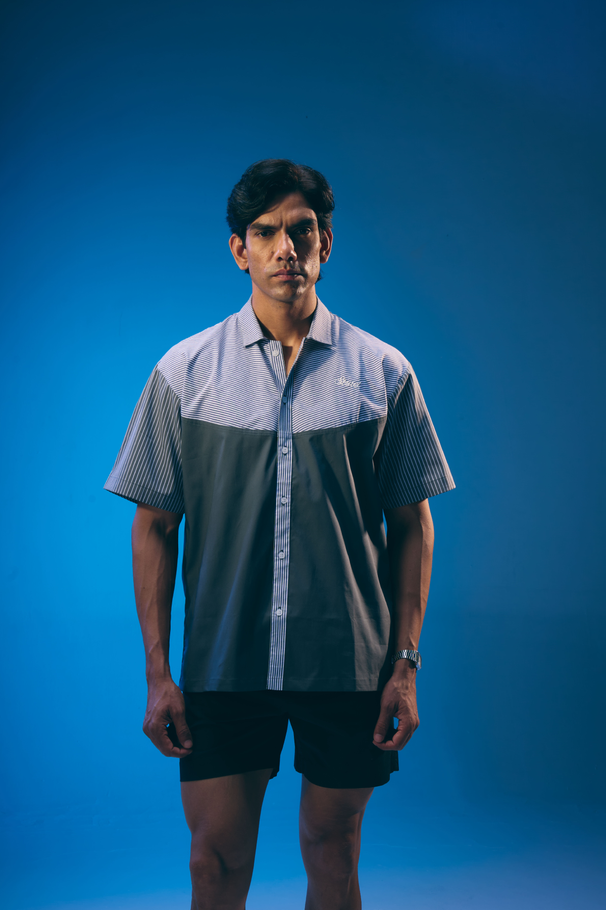 A loose-fit short-sleeve shirt featuring tonal grey pinstripe panels on the chest, sleeves, and collar. Charcoal body with a striped placket and embroidered "Struct" logo on the chest.