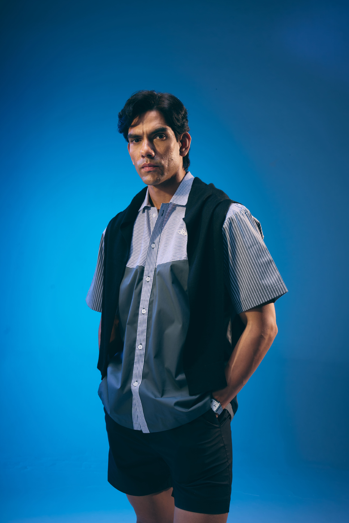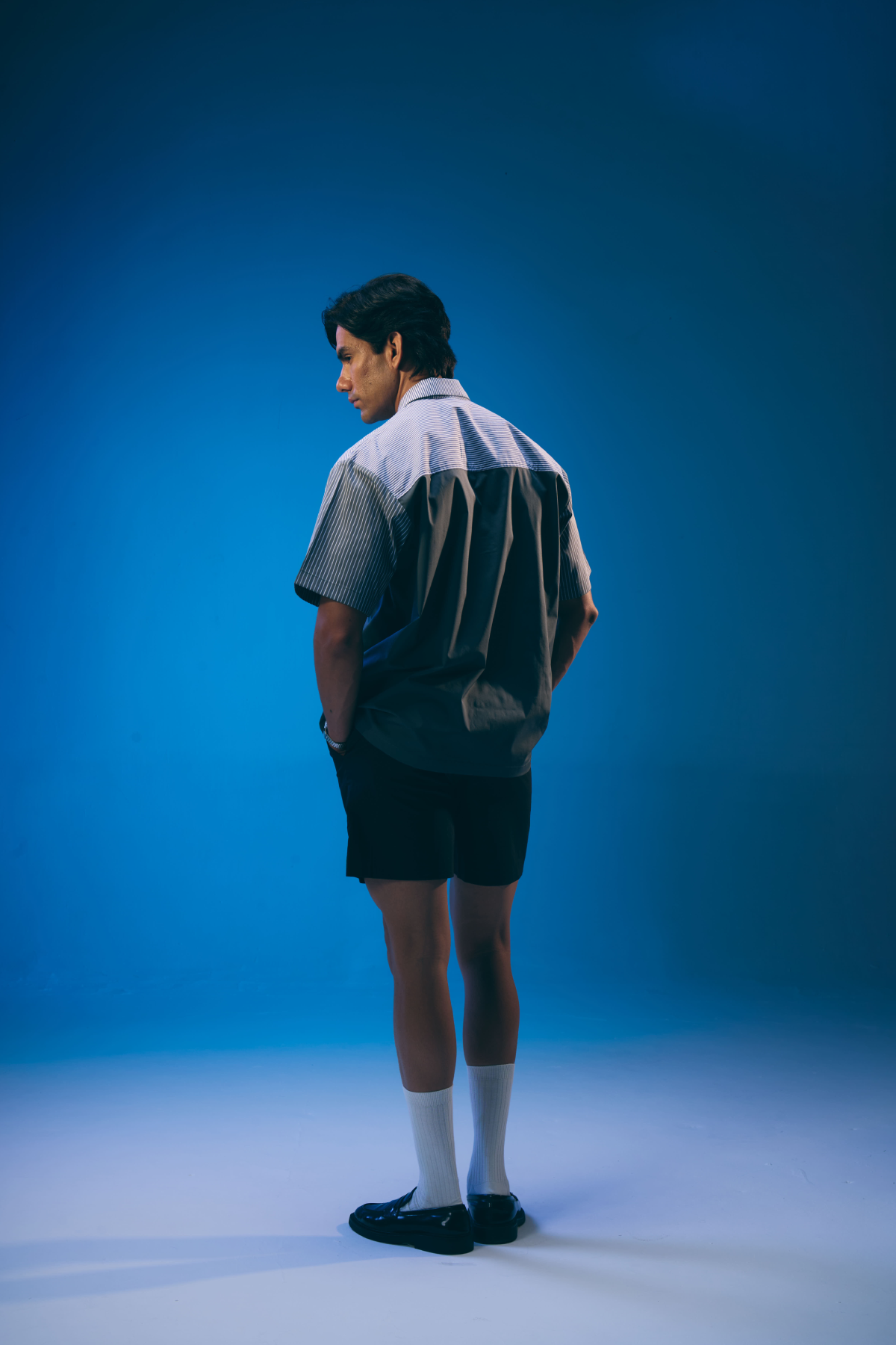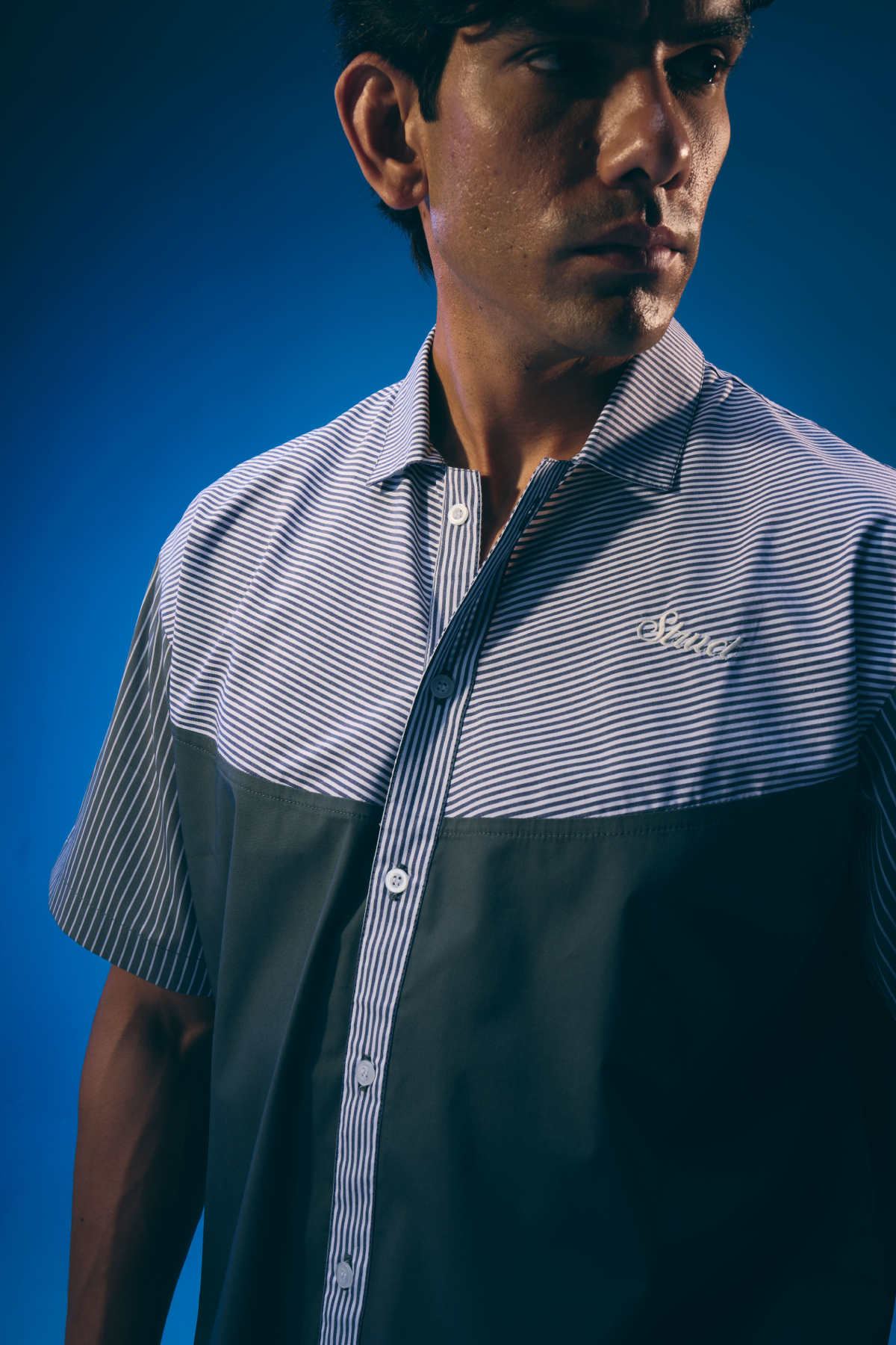 A loose-fit short-sleeve shirt featuring tonal grey pinstripe panels on the chest, sleeves, and collar. Charcoal body with a striped placket and embroidered "Struct" logo on the chest.