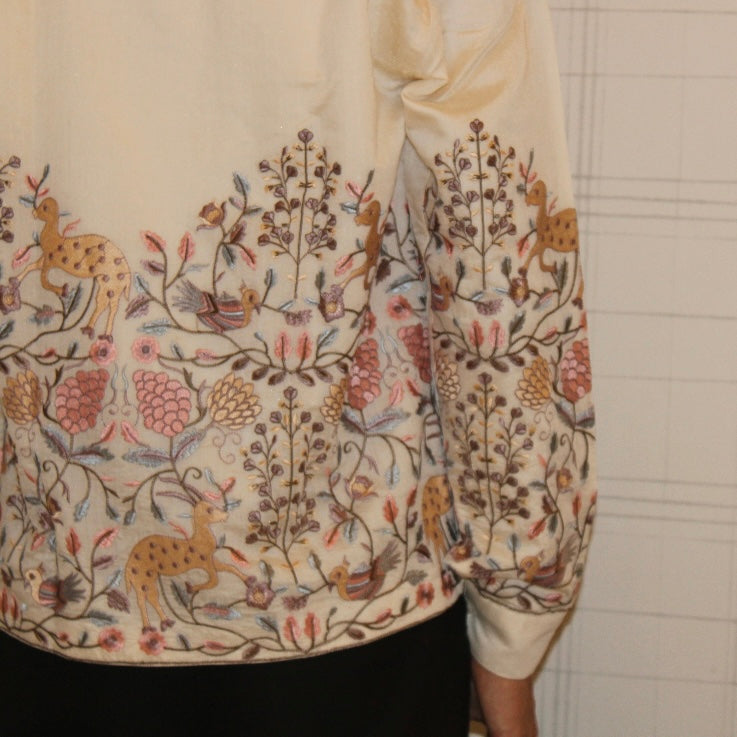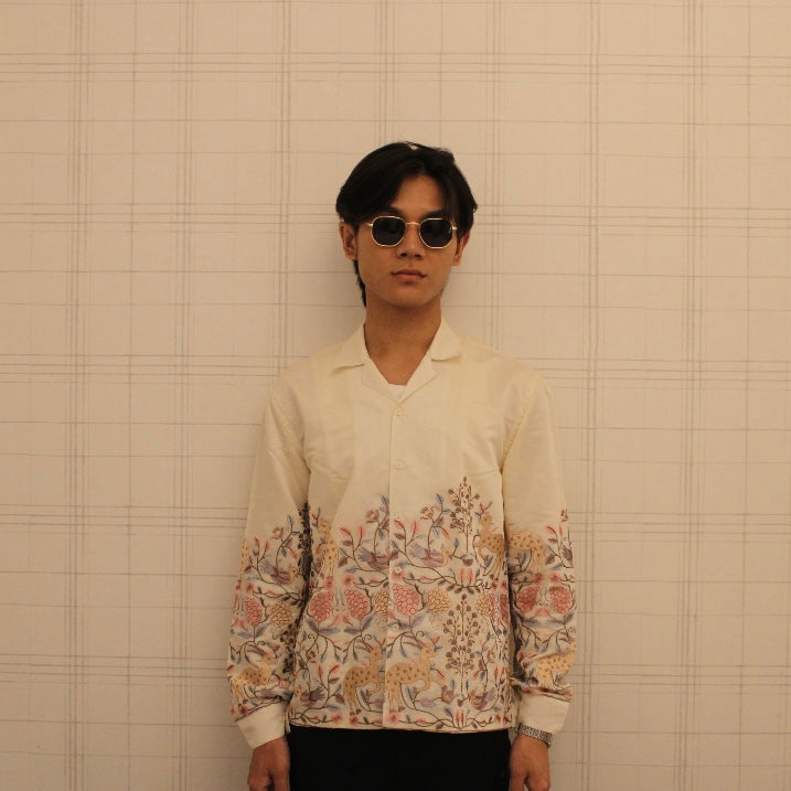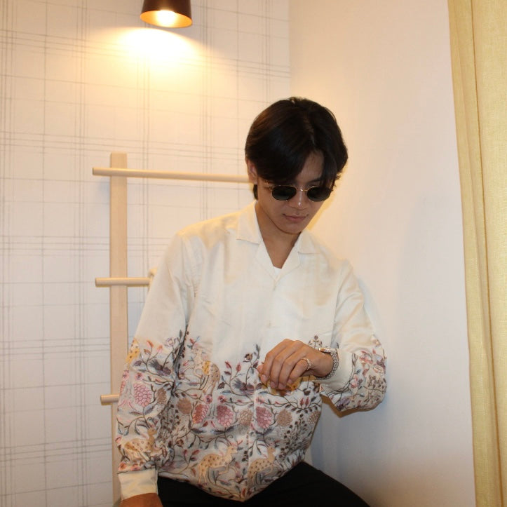 Crafted in shimmering Chanderi silk with a luxurious synthetic silk lining, the Maricha Shirt blends timeless elegance with contemporary flair. The pastel embroidery tells a delicate story of twilight blooms and serene horizons, making each wear a journey through subtle beauty. The Cuban collar adds a modern touch, seamlessly merging tradition with innovation.