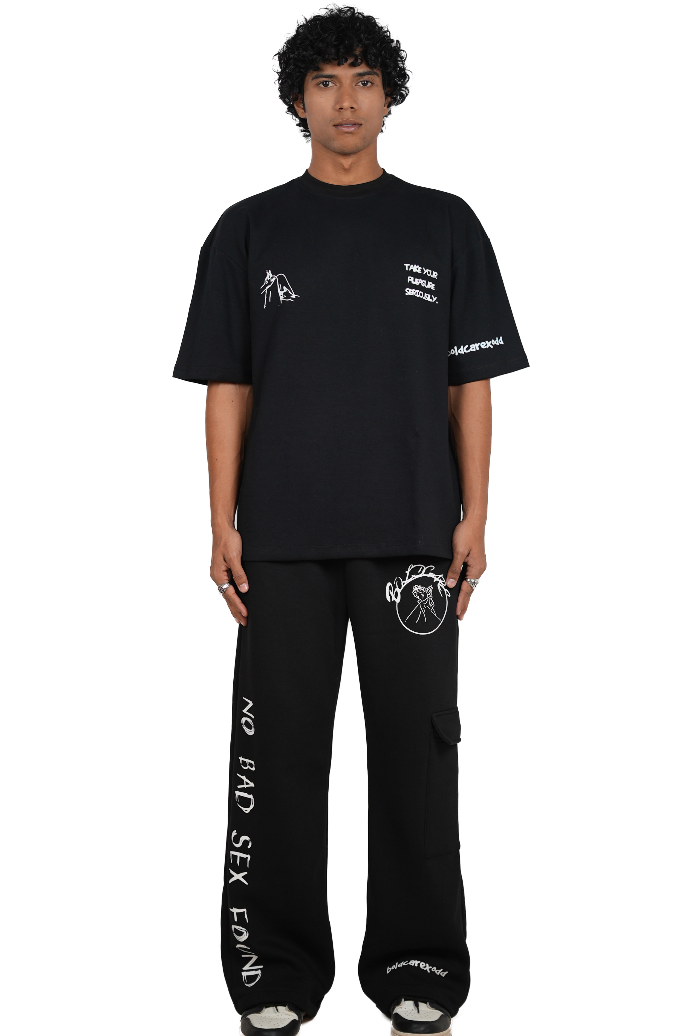 Straight Fit Pants featuring screen-printed elements on the front and back with elasticated waist band. Cargo-Pocketed With Cross pocket Detailing