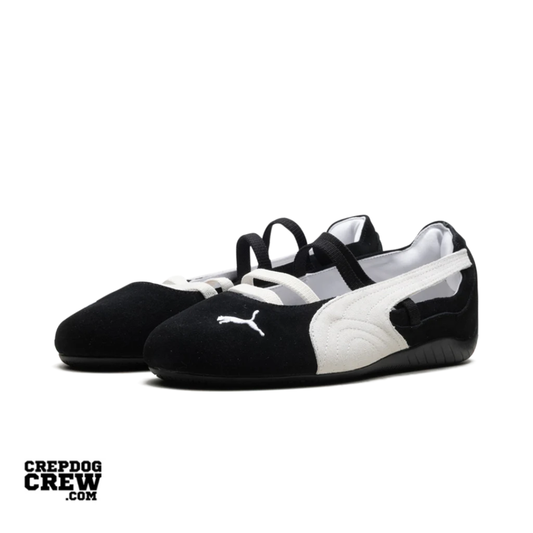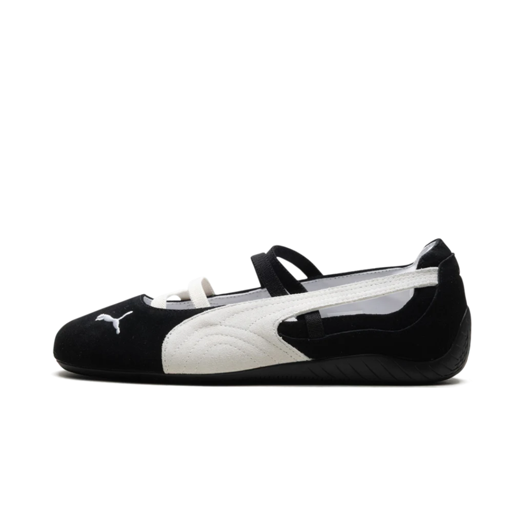 The Puma Speedcat Ballet Black White (W) blends motorsport heritage with a sleek, fashion-focused design. Its upper is made from smooth synthetic suede in a deep black finish, contrasted by a crisp white Puma Formstrip that adds bold visual definition. The low-profile, ballet-inspired silhouette provides a snug, glove-like fit, enhanced by a lightly cushioned insole for everyday comfort. Signature Puma branding on the lateral side and tongue nods to its racing roots, while the slim rubber outsole with a rounded driver’s heel ensures excellent grip and responsive control. This model offers a versatile look that transitions effortlessly from sporty casual wear to lifestyle styling.