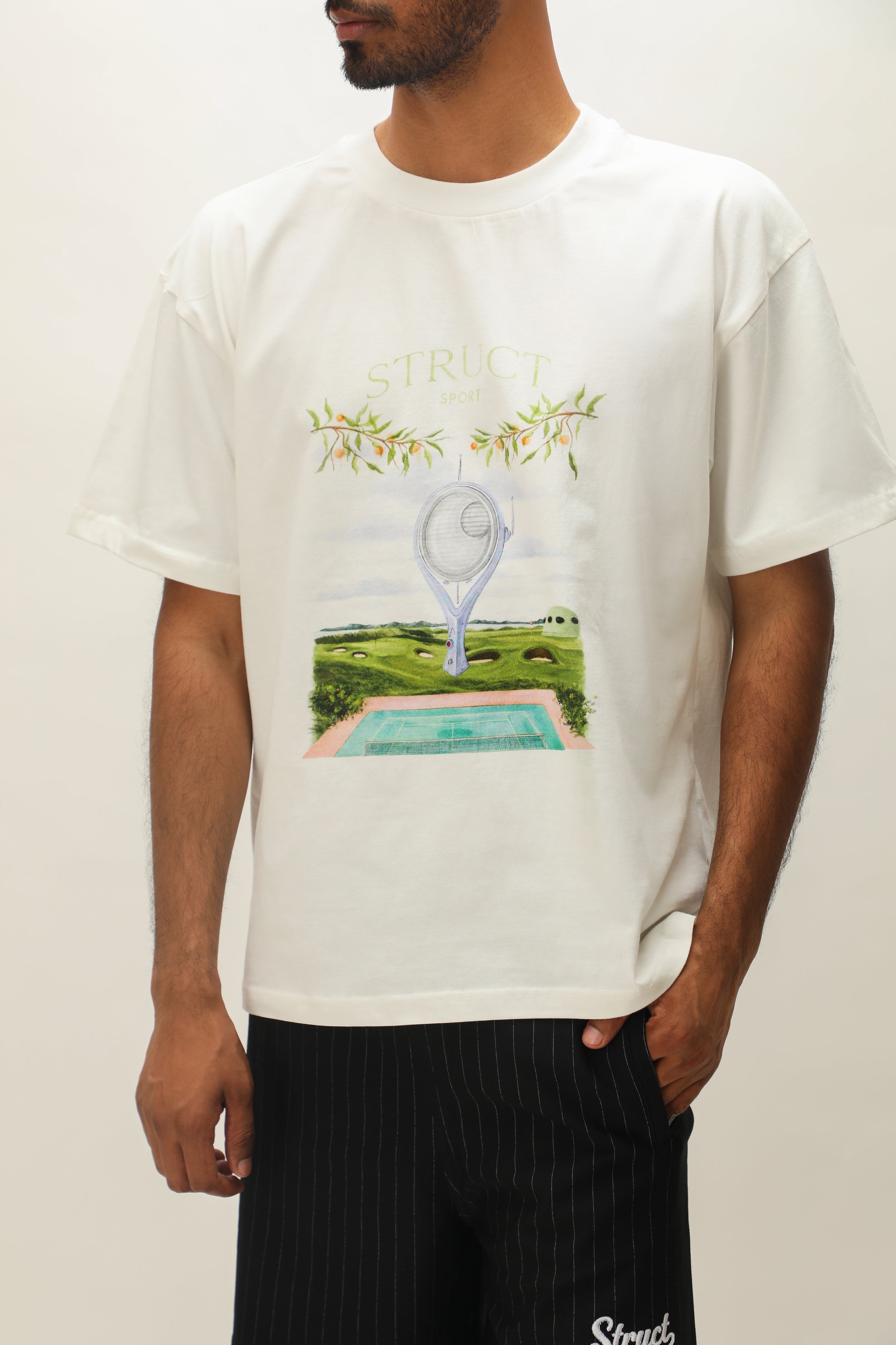 The SS23' Tennis Whites T-shirt is inspired by the '60s retrofuturism creative arts movement identified by a specific blend of old-fashioned "retro styles" with futuristic technology. The printed artwork depicts a tennis court featuring a tennis racket reimagined as a futuristic device, craters in the background and a dome. The T-shirt has an oversized unisex fit.