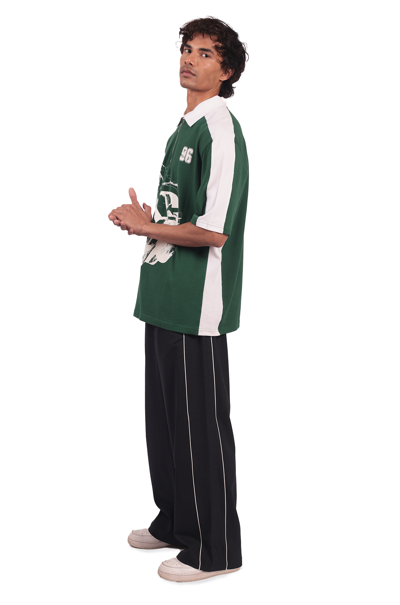 Details include a polo collar, zipper front, and a paneled design. The shirt is finished with water-based screen-printed graphics, capturing the unyielding winning spirit that defines Shreyas.