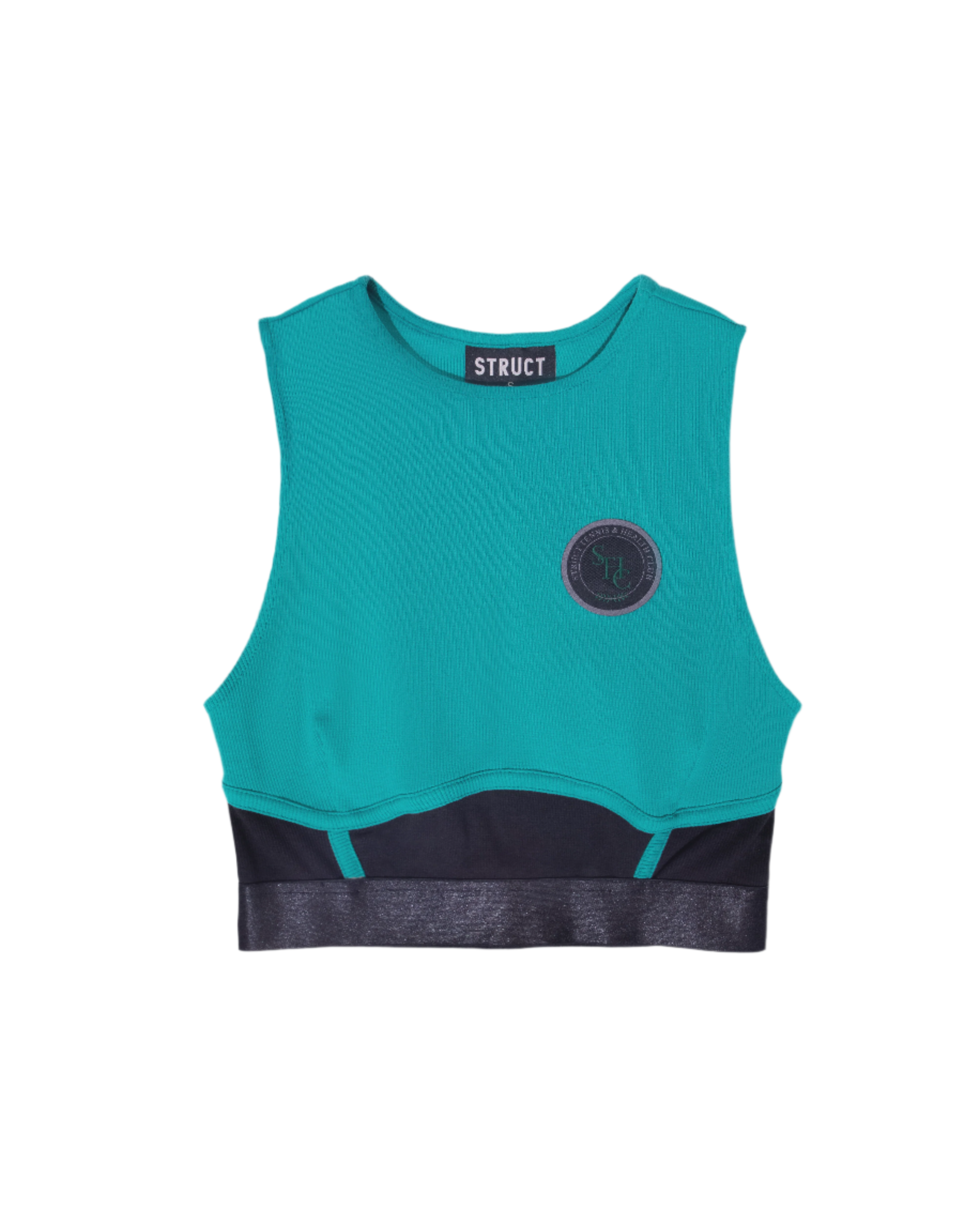 Sports inspired panelled crop top featuring the signature "Struct Tennis & Health Club" logo patch