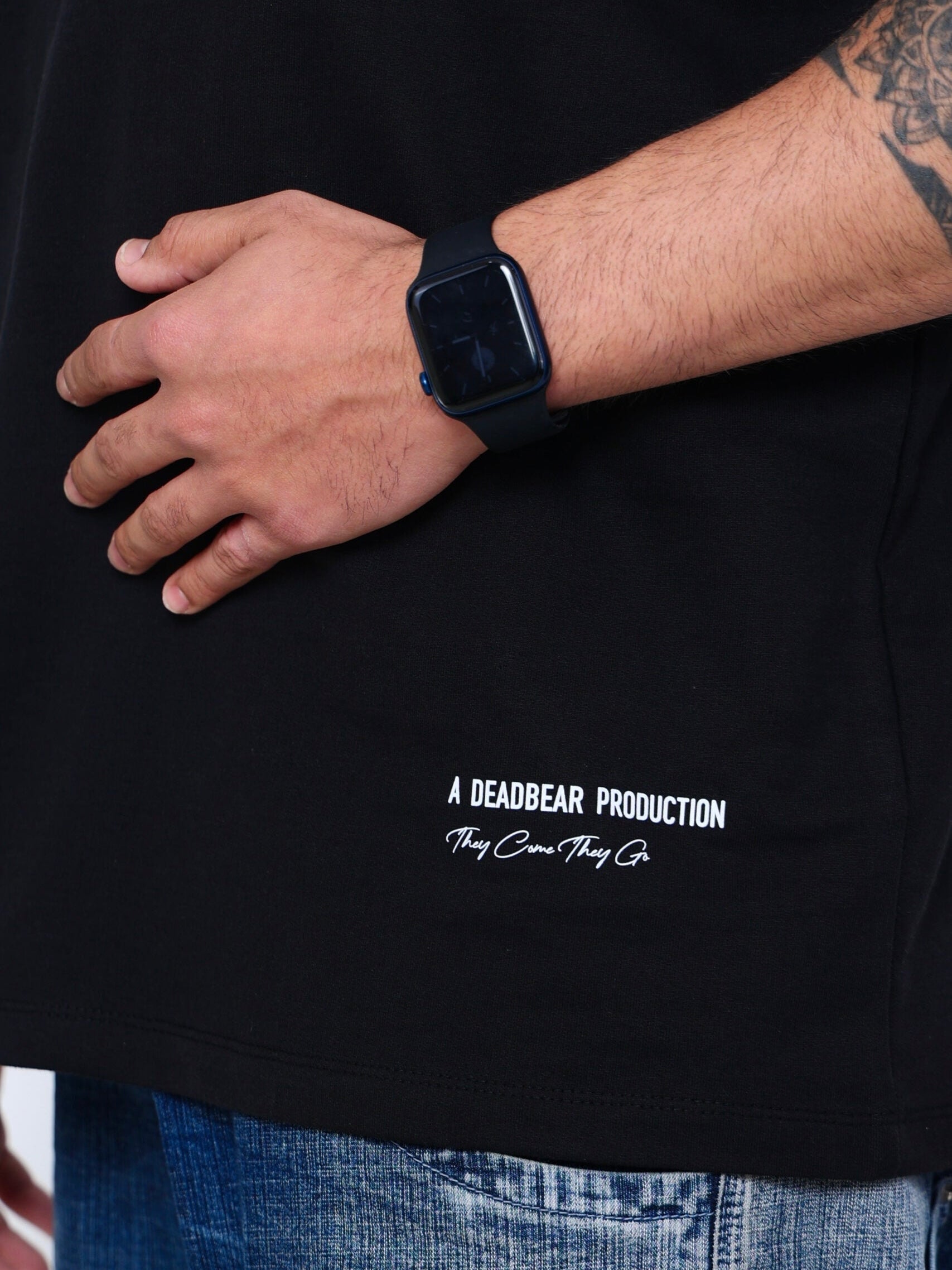THEY COME THEY GO black oversized t-shirt made with love using screen prints with graphics at front, sleeves, and back.