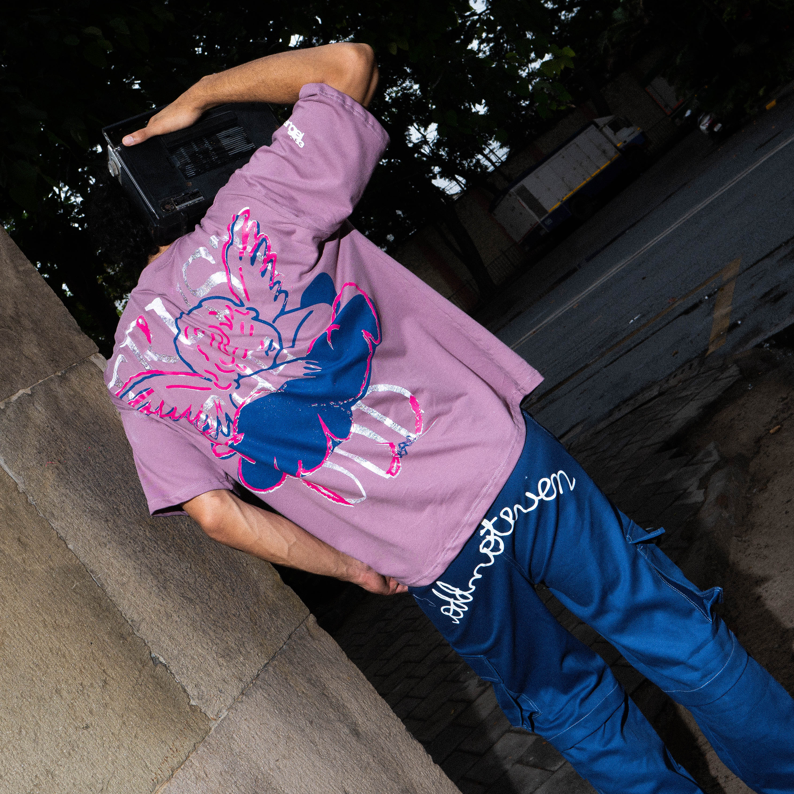 Oversized fit t-shirt with ribbed crewneck collar. Hand scribbled artwork to the front & back finished in puff printing.