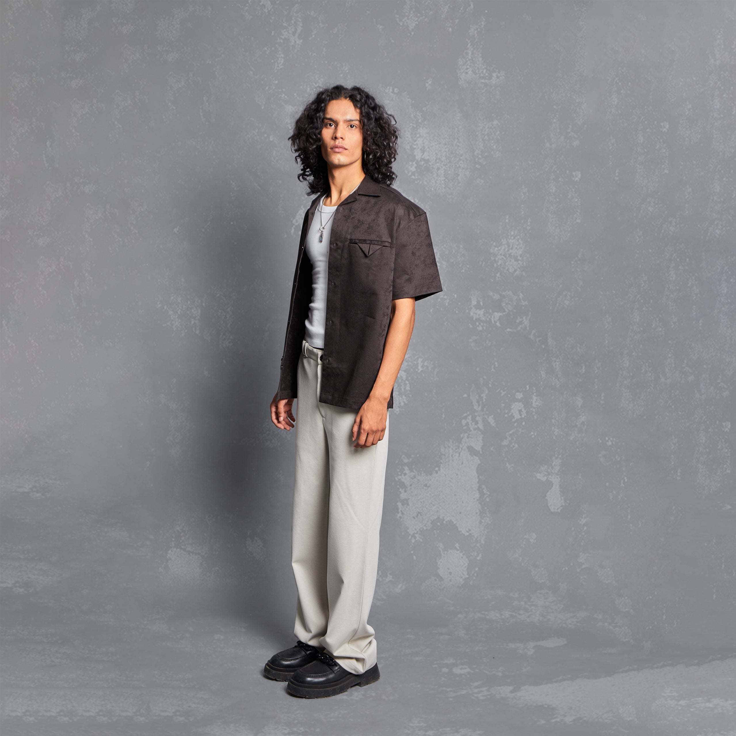 The WT Jacquard shirt is built in an abstract tonal pattern. It features a welt pocket with a fixed pleated pocket square. Designed in a one piece Cuban style collar, it also comprises of a slit at the bottom of the side seam.